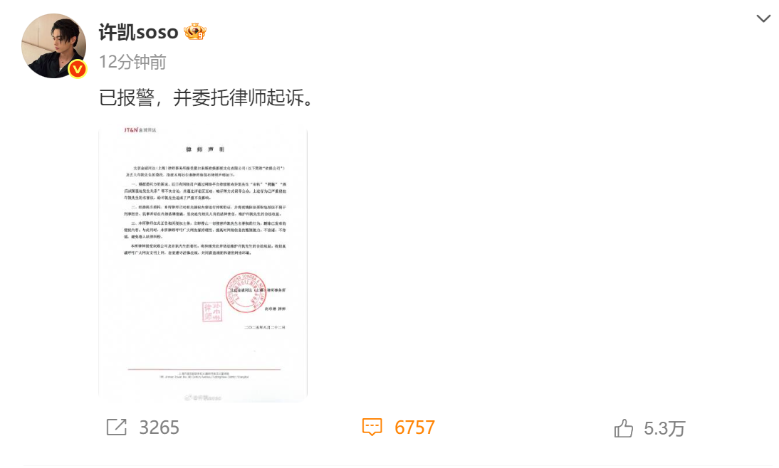 截至发稿,这事儿还没完,下午四点多许凯发了律师声明“已报警,并委托律师起诉。”但他的声明显然只是启动舆论战的新阶段,而并没有画上休止符,因为许荔莎并没有被吓退,而是转发了他的内容,并调侃“我也需要律师,求推荐。”
