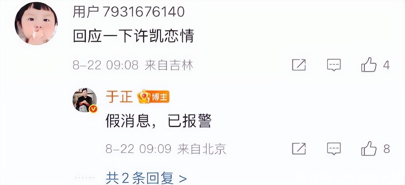 结果于正的操作把我看呆了。扔出来六个字——假消息,已报警。