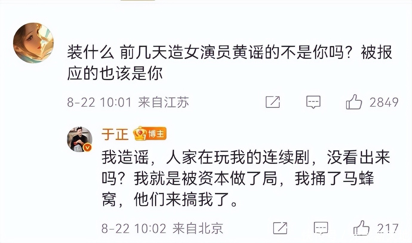 而且让我一口水喷出来的,是于正竟然说自己“被资本做局”,就算是真的,这话也不能往出说,难道于正不知道在网友的眼里,他自己就是资本吗?