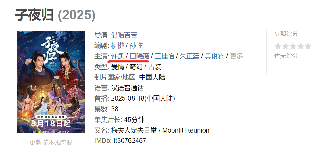 后面许荔莎又提到了《子夜归》,顺便把田曦薇也拉上了热搜。在这里田曦薇是躺枪的,她不过是《子夜归》的女一号,而这部剧的男一号是许凯,8月18日才开播。