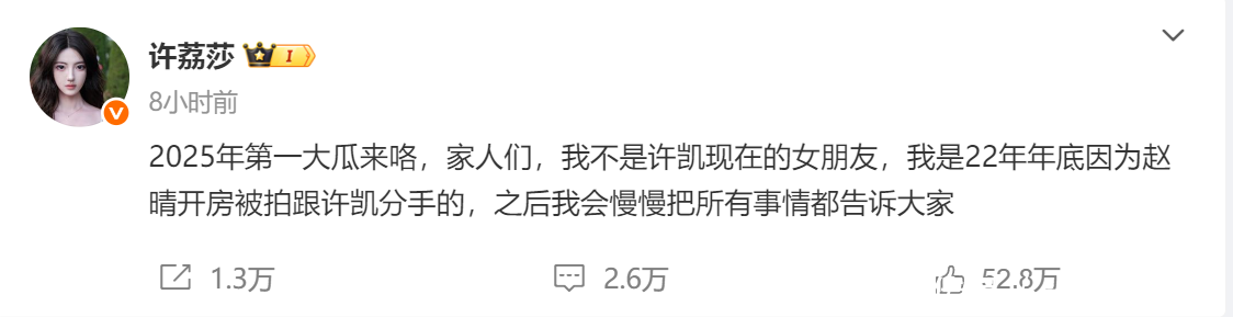 据许荔莎声称,之后双方开始恋爱、吵架、暂时分开等,男女谈恋爱的过程其实都差不多,在这里就不浪费笔墨了,重点是许荔莎自称分手原因是2022年底许凯和赵晴“开房”。
